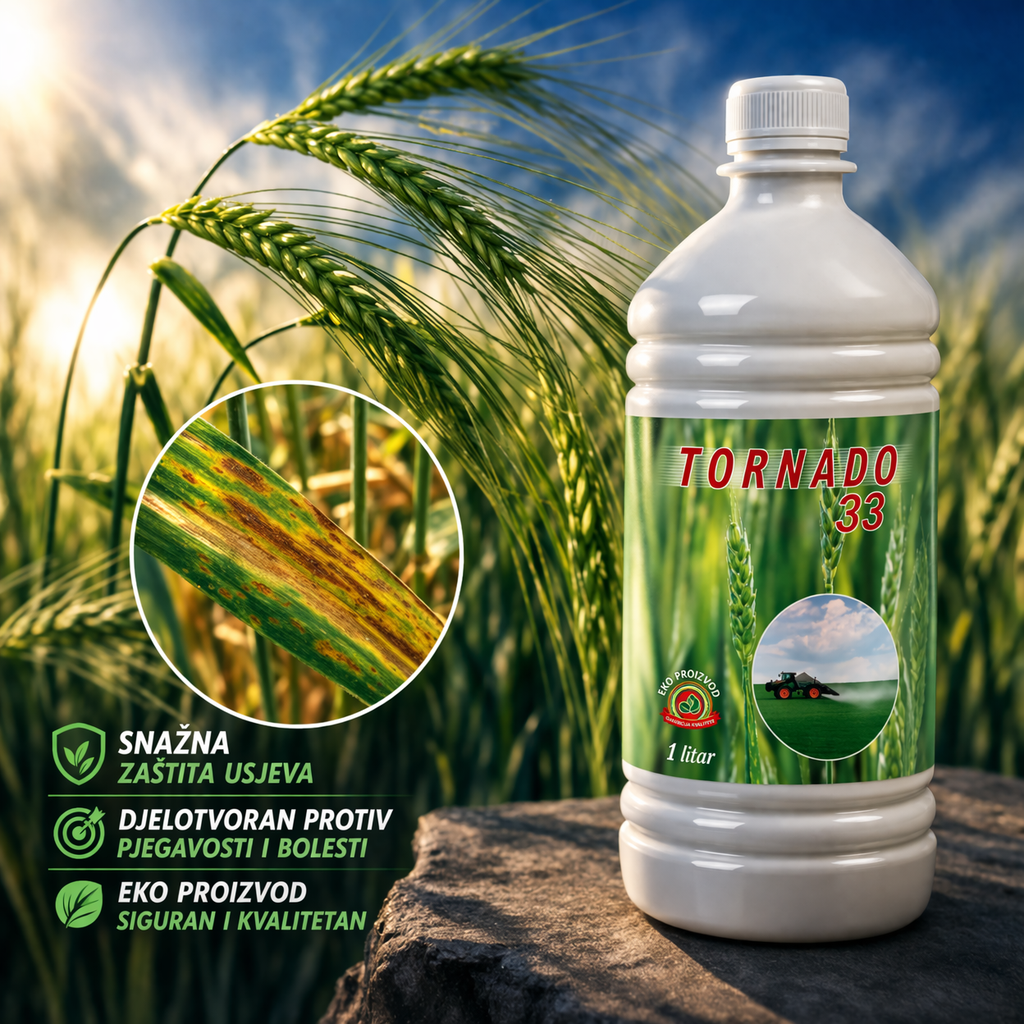 TORNADO 33 je specijalizovani organski proizvod dizajniran za vrhunsku zaštitu strnih žita od najčešćih i najopasnijih biljnih bolesti. Zahvaljujući svom 2 u 1 dejstvu, ovaj preparat djeluje kao snažan biofungicid i repelent, štiteći usjeve od pepelnice (Blumeriella graminis), pjegavosti lista (Septoria spp.), rđe (Puccinia spp.), a naročito od fuzarioze klasa (Fusarium spp.).